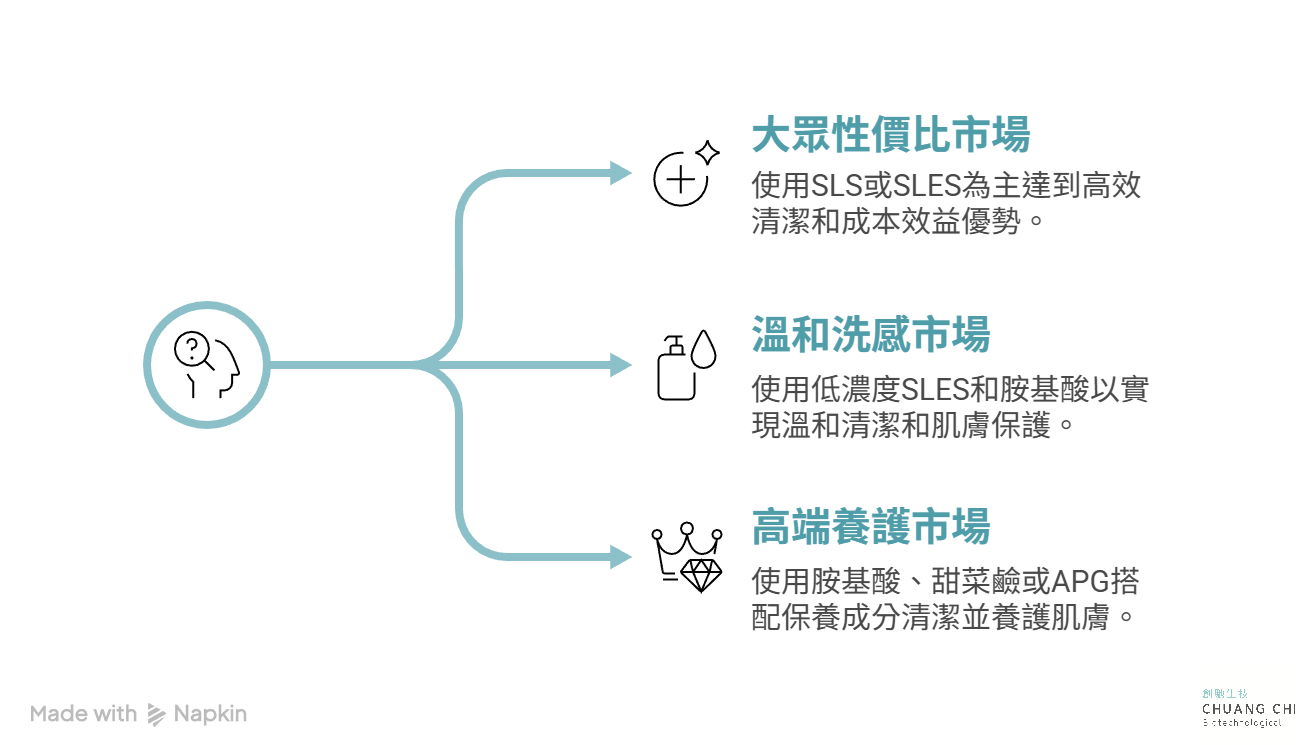 若品牌以低刺激、保護肌膚屏障為訴求,同時希望提升產品毛利,建議優先考慮使用低濃度SLES,搭配胺基酸型界面活性劑,達成溫和清潔、洗後肌膚不緊繃目的。高端養護市場